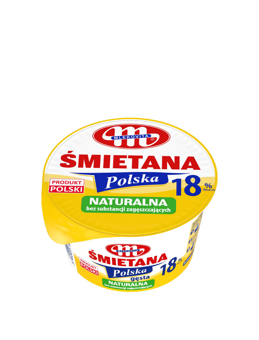 Śmietana Polska 18% jest otrzymywana z surowca najwyższej jakości. Śmietana charakteryzuje sie przyjemnym, świeżym zapachem, jasnokremową barwą oraz jednolitą, gęstą konsystencją, wyróżniającą je spośród innych produktów tego typu. Śmiatana Polska stanowi kompletny asortyment, odpowiadający zróżnicowanym potrzebom konsumentów. Jest doskonała do tworzenia apetycznych kompozycji potraw o wyśmienitym smaku. Śmietana Polska 18% jest idealna do zup, sosów, sałatek i innych dań, których smak wymaga podkreślenia gęstą, lekko kwaśną śmietaną.