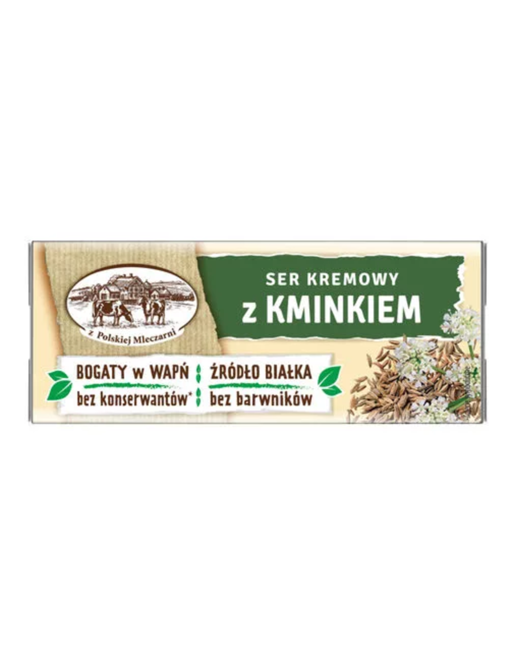 Składniki: sery 50% (dojrzewające i twarogowe); woda; masło; mleko w proszku; sole emulgujące: E450 i E452; kminek 0,2%; regulator kwasowości: kwas cytrynowy; sól; stabilizatory: karagen, E415.